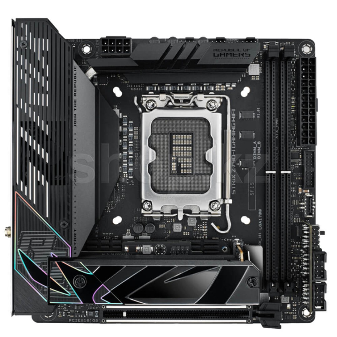 ROG Strix Z790-I Gaming WiFi обладает множеством достоинств, которые облегчают сборку и настройку игрового компьютера в компактном форм-факторе mini-ITX. Мощная система питания с эффективным охлаждением поможет раскрыть весь потенциал процессоров Intel Core 13-го поколения. Поддержка передовой памяти DDR5 и видеокарт с интерфейсом PCIe 5.0 означает повышенную частоту кадров в играх. Встроенный контроллер Wi-Fi 6E гарантирует скоростное подключение к беспроводным сетям, а слоты M.2, работающие в режиме PCIe 5.0 и 4.0, позволят современным твердотельным накопителям показать все свои возможности.