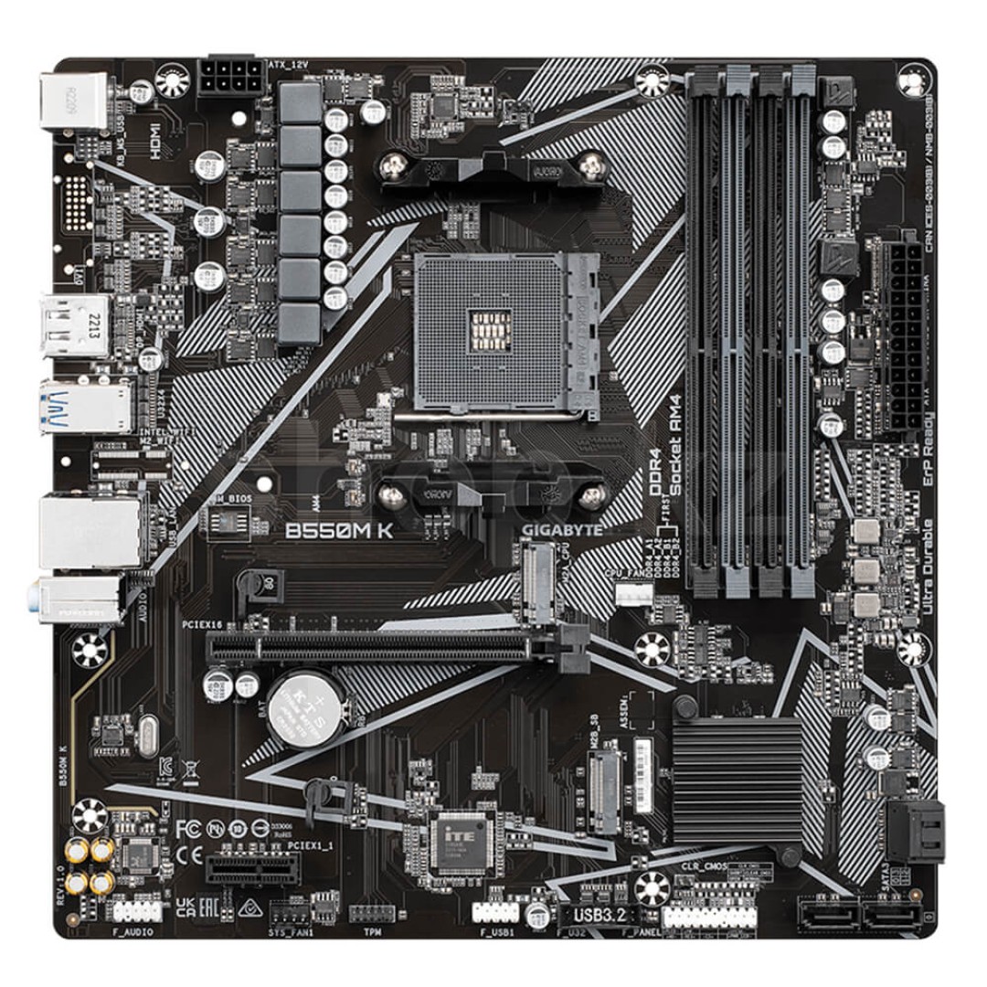 Основные характеристики Материнская плата, Gigabyte, B550M K (4719331852764), AM4, B550, 4xDDR4 2400/2667/3200, 4xSATA3, 2xM.2 (1*PCIe 4.0 x4/x2 и SATA, 1*PCIe 3.0 x2), 1xHDMI, 1хDP, 1xPCI-Ex16, 1xPCI-Ex1, mATX