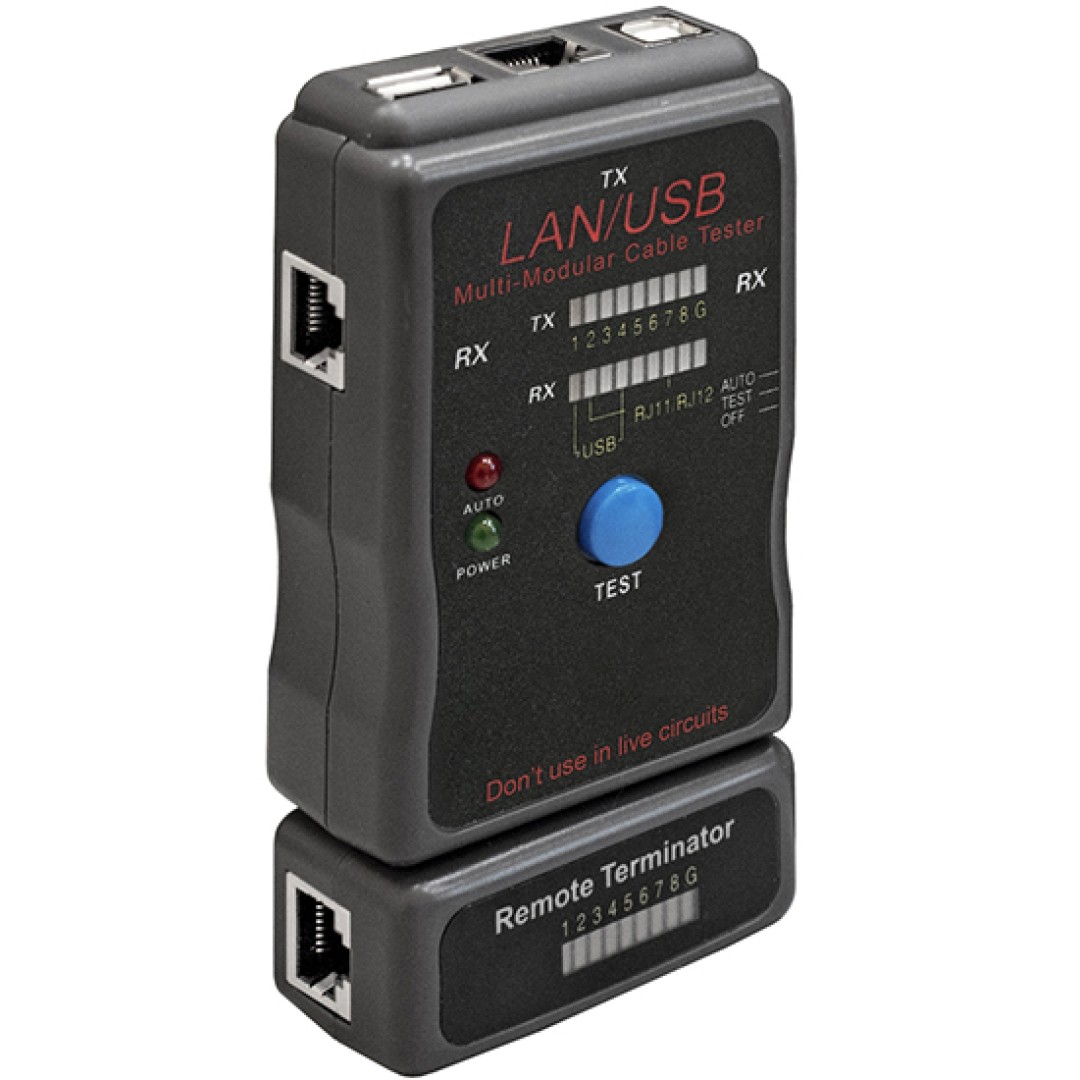 Тестер для телефонного кабеля и кабелей на основе витых пар. Определяет правильность соединения каждого провода в кабеле, правильность обжима, наличие обрыва или короткого замыкания, а также целостность экрана для экранированной витой пары.